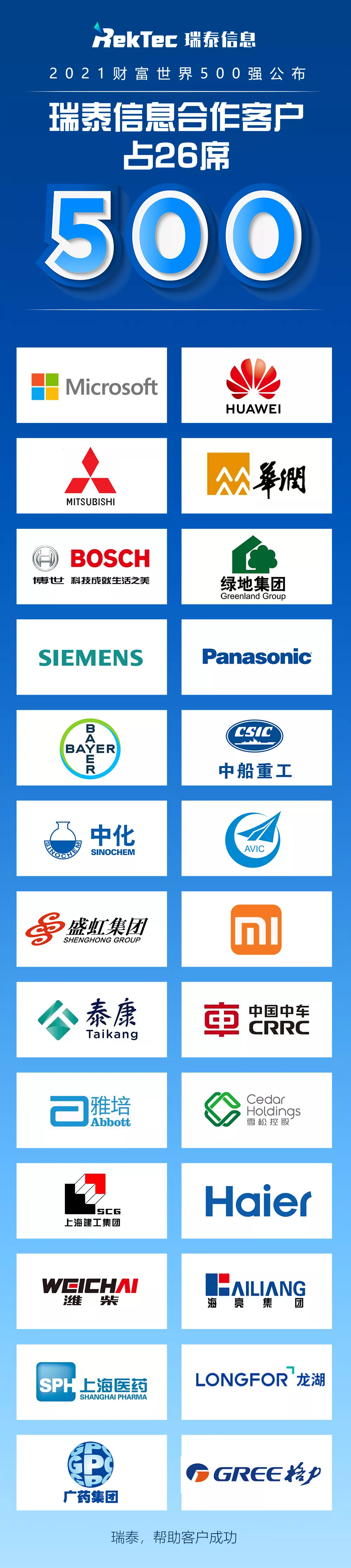 更加值得高興的是,瑞泰信息26家標(biāo)桿合作客戶入榜世界500強(qiáng),其中,19家是中國企業(yè)。對此,瑞泰信息向所有合作客戶表達(dá)最真誠的祝福和最熱烈的祝賀,也感謝在過去的合作中,所有合作客戶給予瑞泰的信任與支持。未來,瑞泰信息將繼續(xù)立足行業(yè)特性,以卓越企業(yè)的專業(yè)素養(yǎng)和能力為更多企業(yè)提供最優(yōu)質(zhì)的服務(wù)。