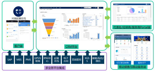 徐工重型CRM系統(tǒng)使用微軟Dynamics365CRM進(jìn)行開發(fā)定制,充分考慮其業(yè)務(wù)寬度與廣度,涵蓋銷售LTC、服務(wù)ITR以及倉儲發(fā)運(yùn)、備件后市場等所有圍繞客戶管理的應(yīng)用,主要由市場管理、目標(biāo)管理、客戶管理、商機(jī)管理、合同管理、發(fā)貨開票回款管理、儲運(yùn)管理、呼叫中心、服務(wù)過程管理以及連接客戶的應(yīng)用等模塊構(gòu)成。通過IOT以及客戶移動端應(yīng)用連接客戶、設(shè)備、駐外銷售人員、經(jīng)銷商,實現(xiàn)客戶滿意度的提升以及整體協(xié)同效率的提升。